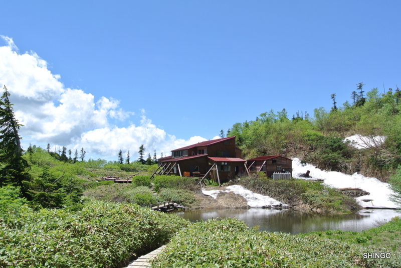 鏡平山荘が見えてきた、森林限界を逆に超え